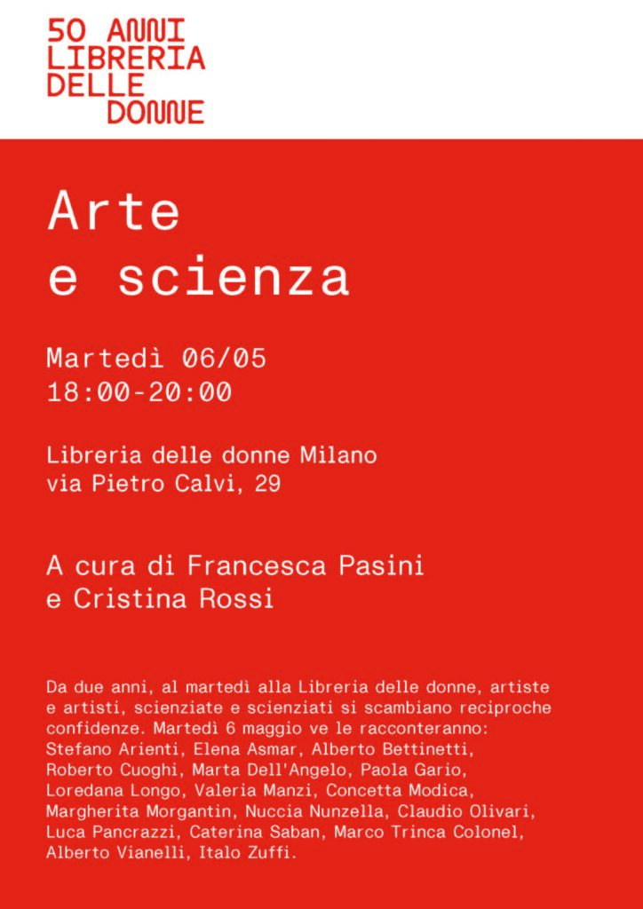 Dalla fine del 2023 la Libreria ospita un ciclo di incontri mensili dedicati al dialogo tra scienza e arte, curati da Francesca Pasini e Cristina Rossi. Il progetto ha coinvolto la matematica Paola Gario, il biologo Claudio Olivari, lo storico della scienza Alberto Vianelli, insieme ad artiste come Elena El Asmar, Marta Dell’Angelo, Concetta Modica, Loredana Longo, Valeria Manzi, Margherita Morgantin, e artisti quali Stefano Arienti, Alberto Bettinetti, Roberto Cuoghi, Luca Pancrazzi, Marco Trinca Colonel e Italo Zuffi. Questo incontro vuole mostrare la ricchezza dello scambio tra scienza e arte, in preparazione di un evento di restituzione alla città di Milano, programmato per settembre 2025. A cura di Francesca Pasini