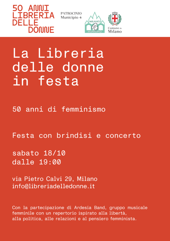 Nata il 15 ottobre 1975 in via Dogana, la Libreria delle donne di Milano è divenuta luogo di incontro, pensiero e relazioni femministe. Dopo un anno di iniziative, il compleanno sarà occasione per ritrovarsi con musica, cibo e brindisi. A dare ritmo la Ardesia Band con il suo repertorio rock, folk e indie. Saranno realizzati foto e video dell’evento. Vi aspettiamo!