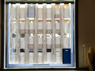 L’opera per “La quarta vetrina” di Margherita Morgantin, in vendita in 10 esemplari, è un sacchetto di plastica bianco con all’interno un disegno di alcuni dettagli architettonici della Libreria delle donne di Milano, a ricordo di un dialogo attorno a una parete di vetro, da cui traspare la differenza tra i pensieri, le cose, gli affetti che scandiscono la vita di donne e uomini.