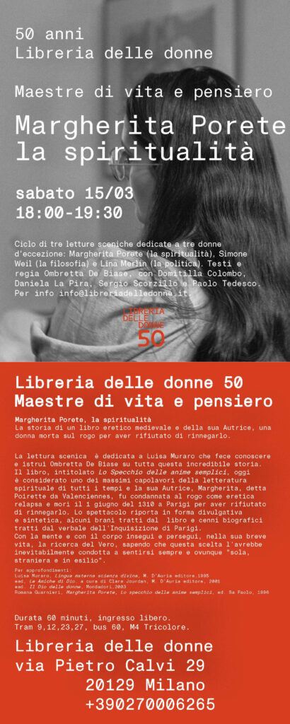 La lettura scenica  è dedicata a Luisa Muraro che fece conoscere e istruì Ombretta De Biase su tutta questa incredibile storia. Il libro, intitolato Lo Specchio delle anime semplici, oggi è considerato uno dei massimi capolavori della letteratura spirituale di tutti i tempi e la sua Autrice, Margherita, detta Poirette da Valenciennes, fu condannata al rogo come eretica relapsa e morì il 1 giugno del 1310 a Parigi per aver rifiutato di rinnegarlo. Lo spettacolo riporta in forma divulgativa e sintetica, alcuni brani tratti dal  libro e cenni biografici tratti dal verbale dell’Inquisizione di Parigi.