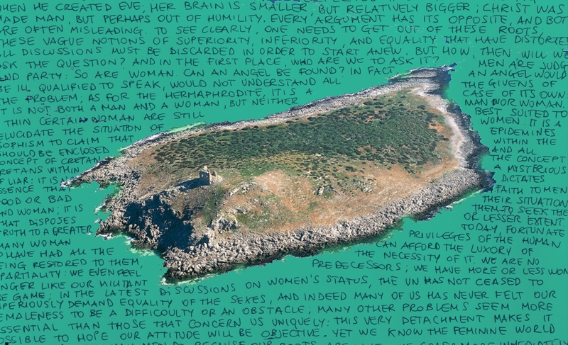 E’ un paesaggio? Anche. Ma soprattutto è la base di finanziamento per comprare l’Isola. Servono tre milioni e mezzo e così Stefania, insieme a Marcela Caldas, Claudia Gangemi, Valentina Greco e Giusi Diana, ha deciso di invitare 350.000 donne a versare 10 euro a testa per diventare proprietarie della propria Isola.