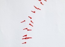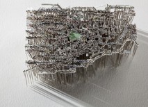 Dall’interno la visione cambia. Il rovescio del ricamo assume la figura di un tracciato astratto. Accanto altre due opere esemplificano il campo d’azione di Elisabetta Di Maggio. Su leggere basi – disegnate da lei – protette da una copertura in plexiglass, si trova una foglia d’edera intagliata col bisturi seguendo le linee delle nervature, e la riproduzione della metropolitana di Tokio, realizzata infiggendo migliaia di spilli sulle linee della mappa.