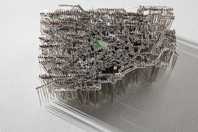 L’azione di una formica che si muove lungo le nervature di una foglia, non è diversa dalla vita di una megalopoli. La complessità della metropolitana, ridisegnata dagli spilli, assume la figura di un microchip di un computer, ma non sono meno complesse le venature di una foglia. In una scala dell’universo ogni oggetto e ogni soggetto si muove dentro griglie e mappature che determinano direzioni e scelte.