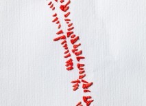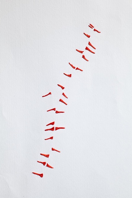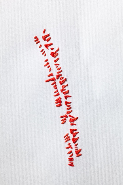 Le ricama su un foglio A4, spina dopo spina, e crea una “mappa genetica” del fiore simbolo dell’affettività. Come lei dice “ogni opera è un evento”, nasce lentamente, col tempo trova fisionomia. Nel procedere del ricamo la figura si moltiplica: da una spina all’altra fa emergere una composizione paragonabile alle sinapsi neuronali.