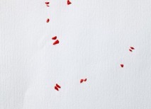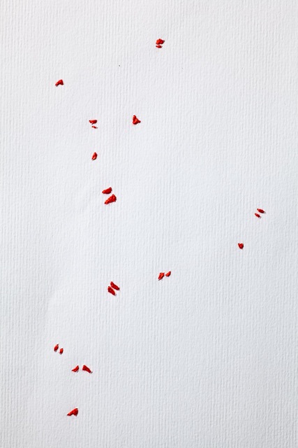 All’esterno la vetrina è ricoperta da fogli A4 su cui sono ricamate in rosso varie tipologie di spine di rosa. Sembrano gocce di sangue, o micro architetture sospese.