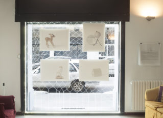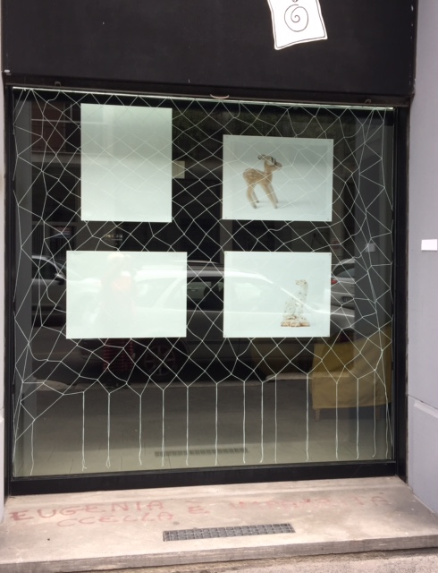 Rivolti verso l’interno ci sono: un bambi di peluche, un cane ferma porte che, nella sua solitudine, acquista un tono orgoglioso e fiero, la casetta, un piccolo mappamondo accostato a una sfera di cristallo, dove il riflesso dell’uno sull’altro crea il sogno della vastità. Guardano verso la strada, di nuovo, il cane e il bambi.