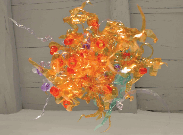 Una miriade di bottiglie tagliate, scaldate e deformate in filamenti quasi organici. Si addensano in vari colori, creano varchi quando le bottiglie sono trasparenti, qualche “organismo” guizza a lato come volesse liberarsi, qualcun altro pende verso terra.