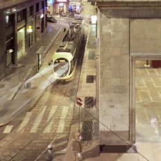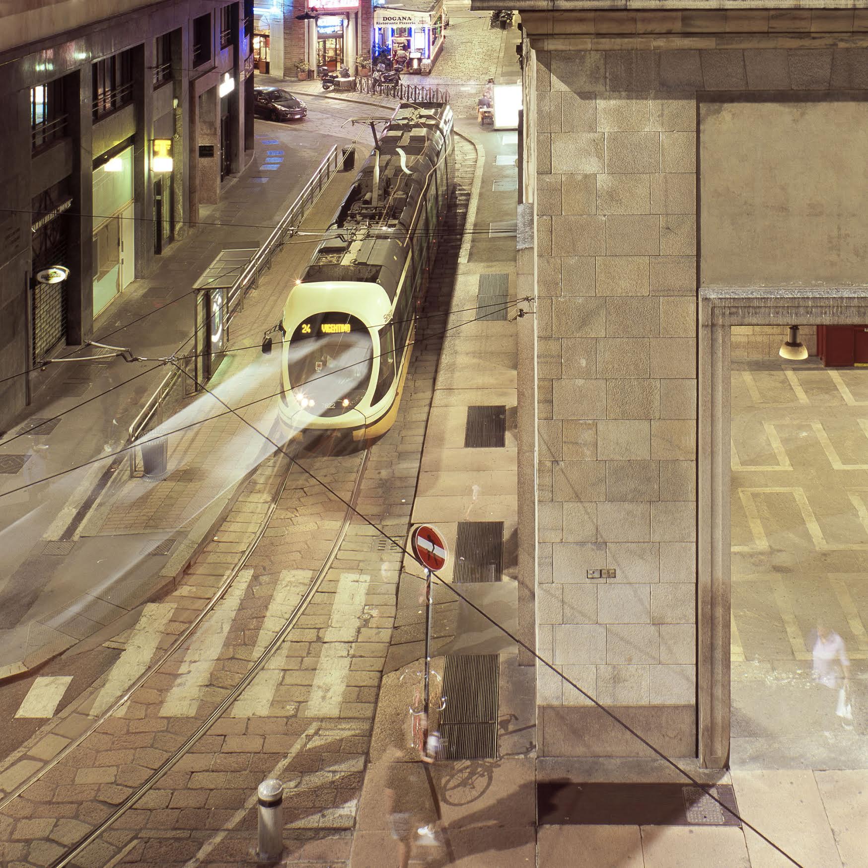 Paola Di Bello, nella mostra al Museo del Novecento, compie un nuovo passaggio. Applica alle vetrate della Sala Fontana, i particolari delle foto di Piazza Duomo stampati su pellicola trasparente, e così aggiunge alla sincronia giorno/notte quella esterno/interno, che traspare tra le figure che si vedono dalle finestre e le foto applicate sul vetro. Il vetro è la chiave di volta che da un lato allude al negativo fotografico, dall’altro collega la trasparenza dell’immagine allo sfasamento delle luci, che fanno capire la sovrapposizione giorno/notte.