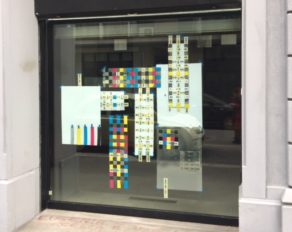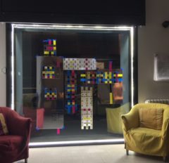 Bruna ha intrecciato i suoi segnalibro in vari “tappeti”, e li ha applicati alla vetrina, facendo così della trasparenza l’elemento per leggere dentro e fuori, sopra e sotto, davanti e dietro. E’ questo che appare con la lettura dell’altro da sé, che prende fisionomia nei libri, nei dipinti, nei film. Provoca subbuglio? Nulla rimane al suo posto?